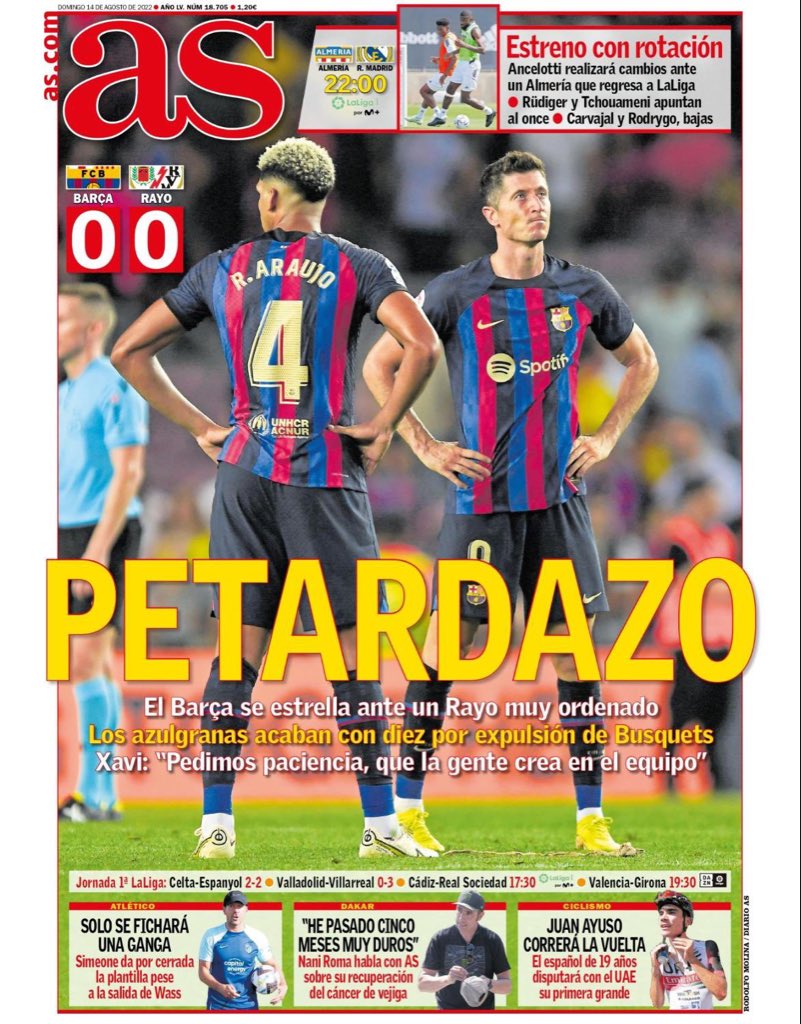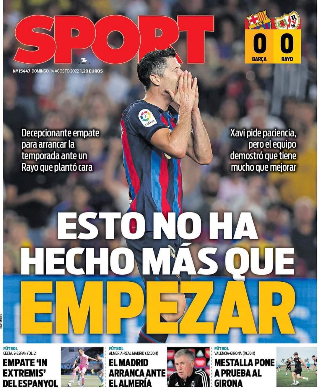 وسلطت سبورت الضوء على البداية المفاجئة لفريق برشلونة في الدوري الإسباني أمام فريق رايو فاليكانو رغم الصفقات والأسماء الموجودة في صفوف الفريق، حيث عنونت بـ إنها مجرد بداية.