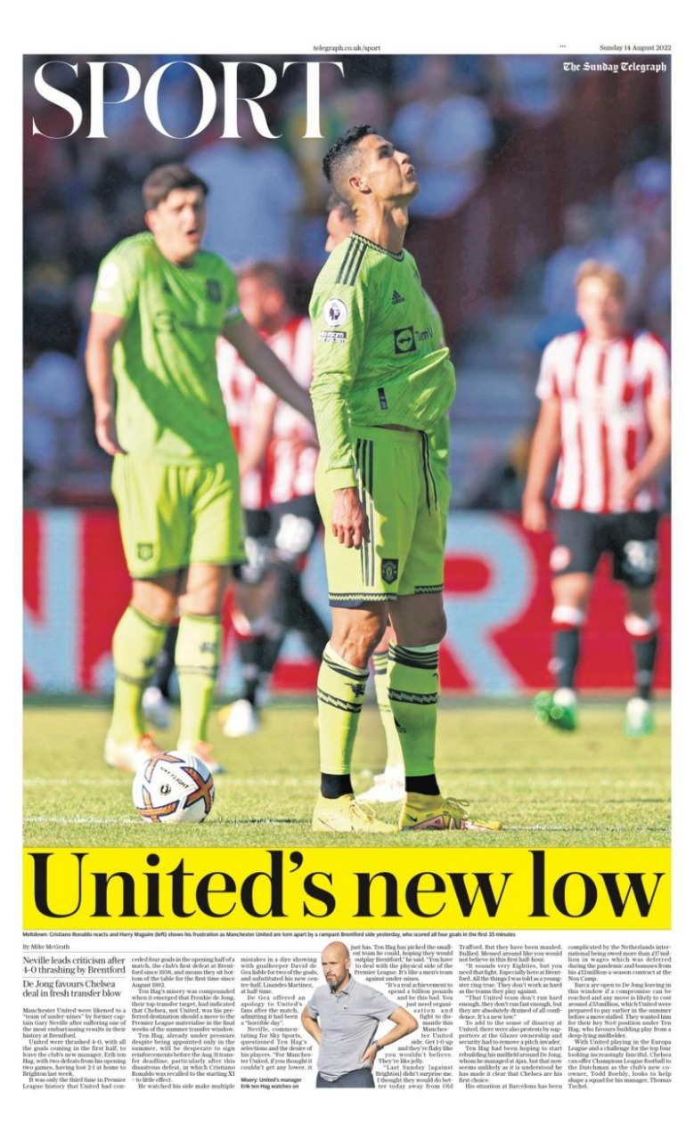 سلطت تيليجراف الضوء على خسارة مانشستر يونايتد من برينتفورد أمس بنتيجة أربعة أهداف دون رد، حيث عنونت بـ مُنخفض يونايتد الجديد، وأشارت إلى أن لاعبي الديفلز في حالة من الانهيار في أول جولتين بالبريميرليج.