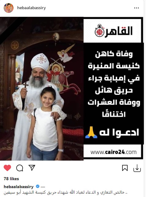 استعانت الإعلامية هبة الأباصيري ببانر تعزية القاهرة 24 لكاهن كنيسة المنيرة بإمبابة، وكتبت على انستجرام: خالص التعازي والدعاء لعباد الله شهداء حريق كنيسة الشهيد أبو سيفين.