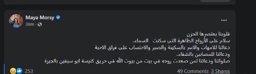وكتبت الدكتورة مايا مرسي عبر صفحتها الشخصية علي موقع التواصل الاجتماعي: عن ضحايا حريق كنيسة إمبابة: قلوبنا يعتصرها الحزن صلواتنا ودعائنا لمن صعدت روحه في بيت من بيوت الله قلوبنا يعتصرها الحزن سلام على الأرواح الطاهرة التي سكنت السماء.. دعائنا للأمهات والاسر بالسكينة والصبر والاحتساب على فراق الاحبة ودعائنا للمصابين بالشفاء.. صلواتنا ودعائنا لمن صعدت روحه في بيت من بيوت الله في حريق كنيسة أبو سيفين بالجيزة.
