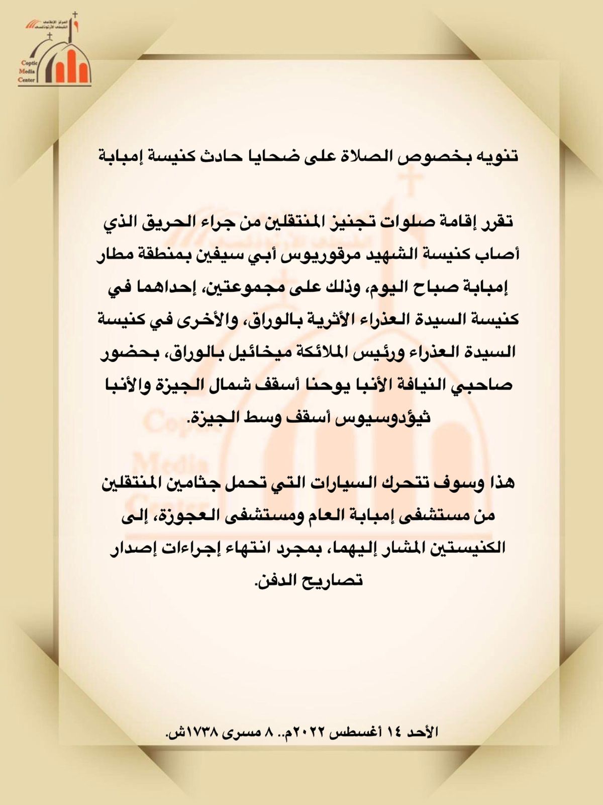 قررت الكنيسة إقامة صلوات تجنيز المنتقلين من جراء الحريق الذي أصاب كنيسة الشهيد مرقوريوس أبي سيفين بمنطقة مطار إمبابة صباح اليوم، على مجموعتين، إحداهما في كنيسة السيدة العذراء الأثرية بالوراق، والأخرى في كنيسة السيدة العذراء ورئيس الملائكة ميخائيل بالوراق، بحضور صاحبي النيافة الأنبا يوحنا أسقف شمال الجيزة والأنبا ثيؤدوسيوس أسقف وسط الجيزة.