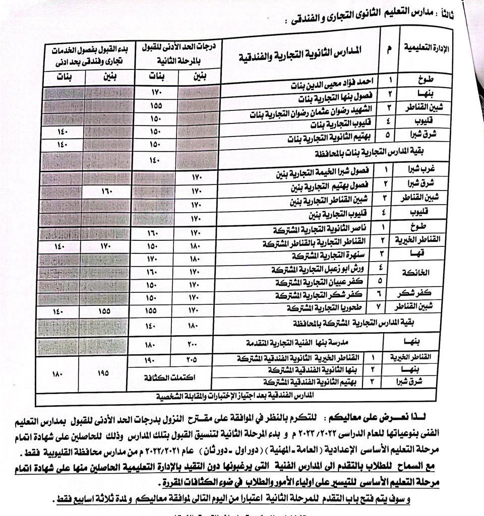 درجات تنسيق القبول بالمدارس الثانوية الفنية لطلاب الدور الثاني بمحافظة القليوبية كالتالي: