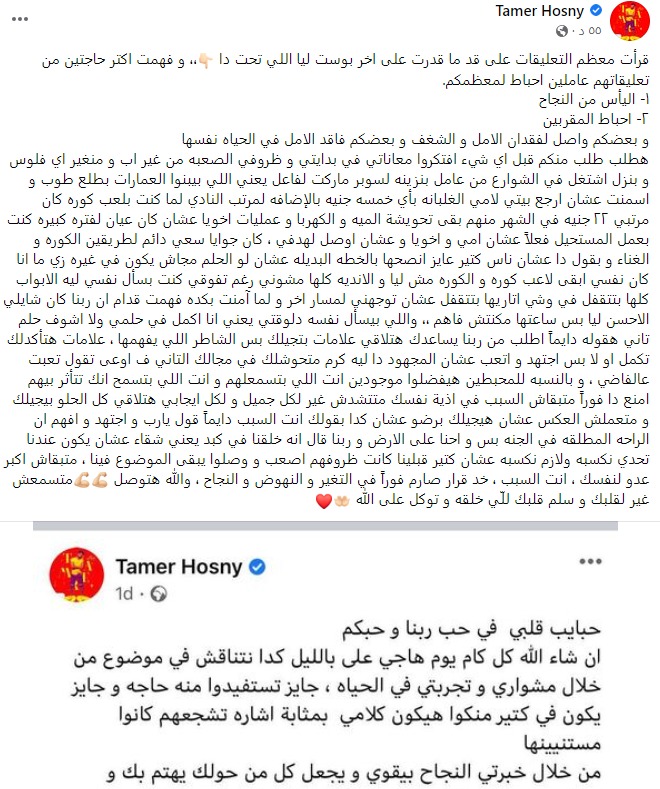 وكتب تامر حسني، منشورا عبر حسابه الرسمي بموقع التواصل الاجتماعي فيسبوك، وإذ قال فيه: قرأت معظم التعليقات على قد ما قدرت على آخر بوست ليا اللي تحت ده، وفهمت أكتر حاجتين من تعليقاتهم عاملين إحباط لمعظمكم، أولًا اليأس من النجاح وثانيًا إحباط المقربين.