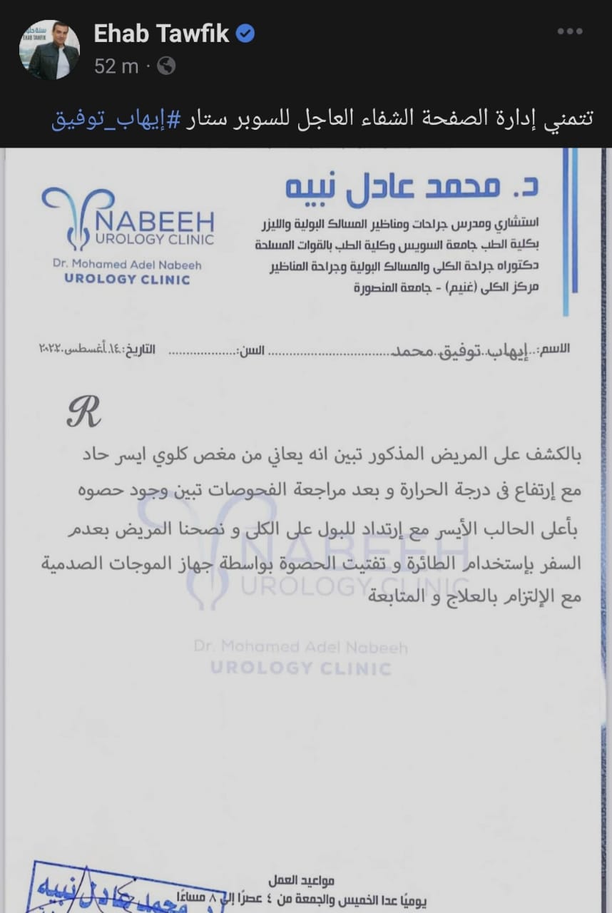 ونشرت الصفحة الرسمية لإيهاب توفيق التقرير الطبي الخاص بالفني، وذلك على فيسبوك، وعلقوا قائلين: تتمنى إدارة الصفحة الشفاء العاجل للسوبر ستار إيهاب توفيق.