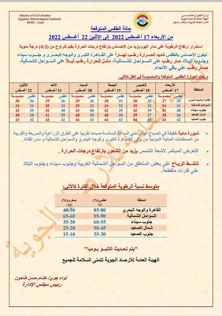 ووفقا لما ذكرته هيئة الأرصاد الجوية، سيكون شديد الحرارة رطب نهارًا، على القاهرة الكبرى والوجه البحري، وجنوب سيناء، وجنوب البلاد، أما السواحل الشمالية تشهد طقس حار رطب في النهار، ومائل للحرارة رطب في الليل، على السواحل الشمالية، ويكون حار رطب على باقي الأنحاء.