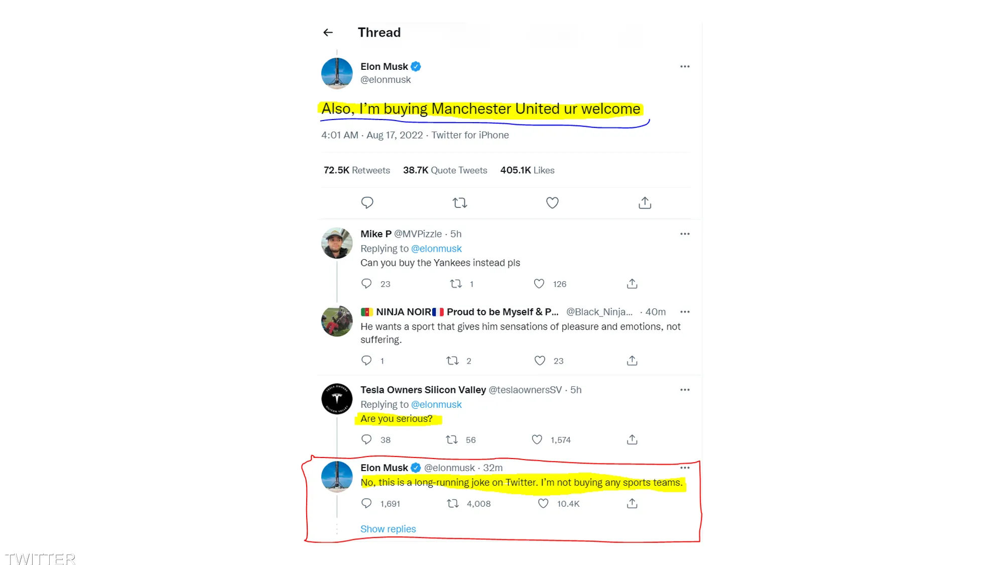 وكتب ماسك عندما سأله أحد المستخدمين حول مدى جدية شراء النادي "لا، هذه مزحة مستمرة منذ فترة طويلة في تويتر، لن أشتري أي فريق رياضي".
