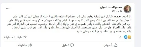 فيما هدد أحمد محمود عمران، أحد عمال شركة يونيفرسال، في منشور له على صفحته الشخصية بموقع التواصل الاجتماعي فيسبوك، بقتل زوجته وأبنائه الأربعة، بسبب الظروف الاقتصادية والمادية الصعبة التي يمر بها، وتراكم الديون عليه.