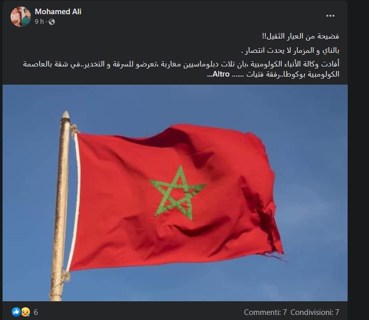 فيما نقلت ذات الصحيفة عن مصادر مغربية رفيعة المستوى، أن سفارة المملكة بالعاصمة الكولومبية تتابع الواقعة، وأن الواقعة تتعلق بدبلوماسيين إثنين وليس 3، أن المعنيين تعرضوا لحادث السرقة بعد تناولهما “واد منومة.