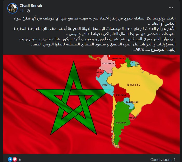 في حين قال آخر يدعى شادي بيراك، إن حادث كولومبيا يندرج في إطار أخطاء بشرية مهنية قد يقع فيها أي موظف في أي قطاع سواء الخاص أو العام، معتبرًا أن الأهم هو عدم وقوع الحادث داخل المؤسسات الرسمية للدولة المغربية أو في مبنى تابع للخارجية المغربية، مؤكدًا أن الحادث شخصي غير مرتبط بالمال العام، وأن جميع الموظفين معرضون للخطأ والصواب.