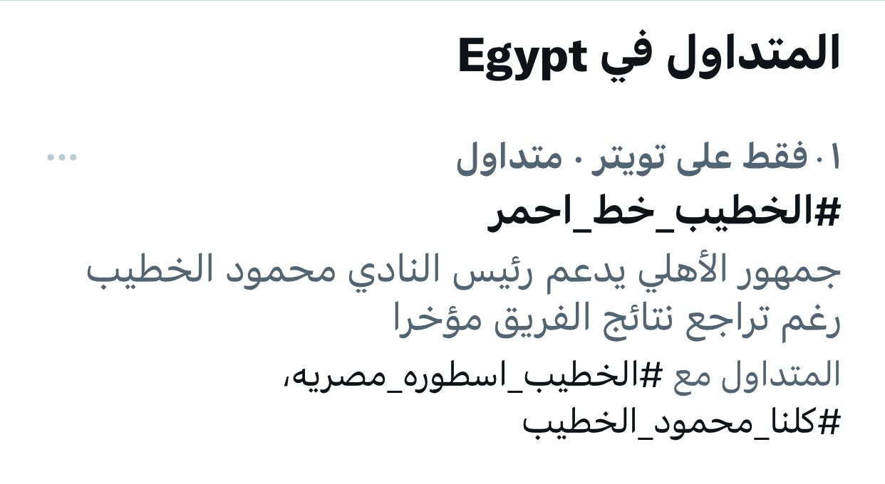 شهد موقع التواصل الاجتماعي تويتر، حالة من الدعم الكبير للنادي الأهلي ومحمود الخطيب رئيس النادي، من خلال هاشتاج الخطيب خط أحمر، والذي تصدر الترند بمشاركة الآلاف من جمهور القلعة الحمراء.
