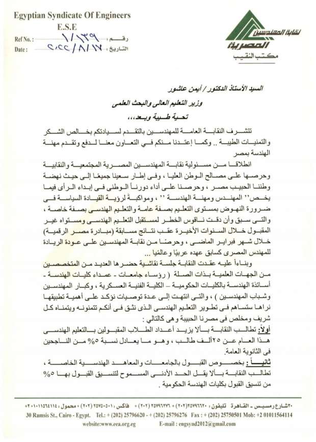 خاطبت نقابة المهندسين الدكتور أيمن عاشور، وزير التعليم العالي والبحث العلمي، وذلك لتتبنى فكرة اقتراح النقابة بإنشاء، نقابـة للتكنولـوجيين وكذلك إنشاء اتحاد بـاسم اتحاد المهن الهندسية.