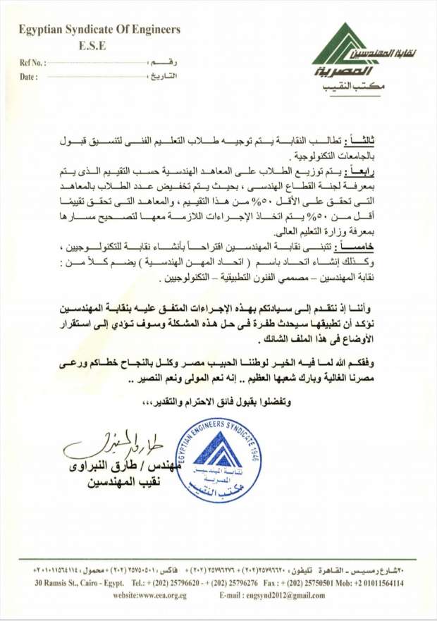 وطالبت النقابة في بيان لها بتوجيه طـلاب التعليم الفني لتنسيق قبول بالجامعات التكنولوجية، وكذلك توزيع الطلاب على المعاهد الهندسية حسب التقييم الذي يتم بمعرفة لجنـة القطـاع الهندسي، بحيث يتم تخفيض عدد الطلاب بالمعاهد التي تحقق علـى الأقـل 50% مـن هـذا التقييم، والمعاهد التي تحقق تقييما أقل مـن 50% يتم اتخاذ الإجـراءات اللازمة معهـا لتصيح مسارها بمعرفة وزارة التعليم العالي.