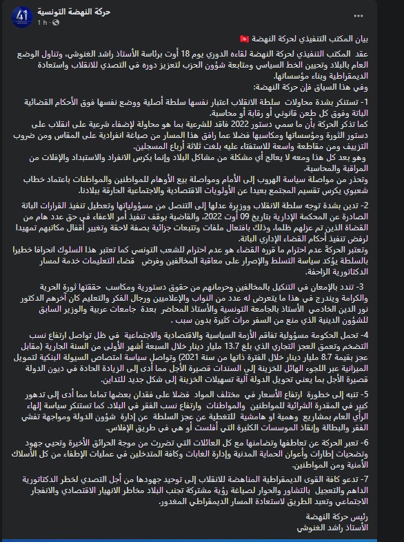 وفي بيان له للمكتب التنفيذي للحركة الإخوانية، أدانت عدم تنفيذ قرارات المحكمة الإدارية بوقف تنفيذ أمر الإعفاء في حق عدد من القضاة الذين تم عزلهم بقرار من الرئيس التونسي قيس سعيد.