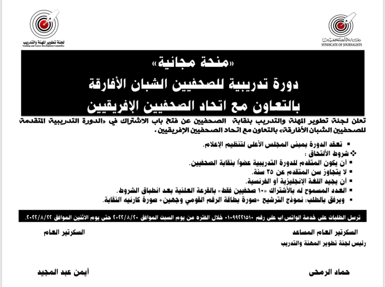 أعلنت لجنة تطوير المهنة والتدريب بنقابة الصحفيين، فتح باب الاشتراك في الدورة التدريبية المقدمة للصحفيين الشبان الأفارقة بالتعاون مع اتحاد الصحفيين الإفريقيين.