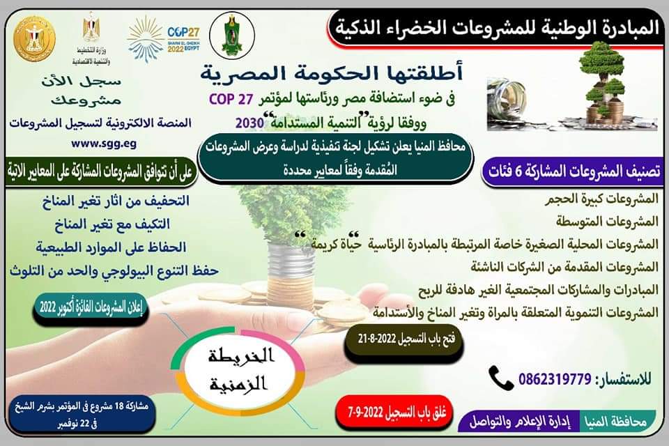 دعا اللواء أسامة القاضي، محافظ المنيا، كافة الجهات المعنية الحكومية والخاصة، وكذلك مؤسسات المجتمع المدني والجهات المهتمة بالمشروعات الخضراء إلى التقدم للمشاركة في المبادرة الوطنية للمشروعات الخضراء الذكية، من خلال المنصة الإلكترونية http://www.sgg.eg، والمقرر بدء العمل بها غدا الأحد الموافق 21/8/2022 حتى يوم الأربعاء الموافق 7/9/2022، للقيام بتسجيل المشروعات الخضراء والذكية عليها على مستوى الجمهورية.