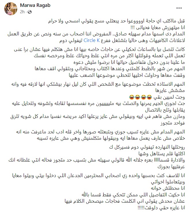 أثارت سيدة تدعى مروة رجب من محافظة الإسكندرية، الجدل عبر موقع التواصل الاجتماعي فسيبوك الساعات الماضية، بعد تعديها بالضرب على صديقتها داخل مقر عملها، وذلك بسبب محاولة الثانية خطف زوجة الأولى، ولقيت مروة هجومها كبيرا عبر موقع التواصل الاجتماعي فيسبوك بعدما نشرت بوست تحدثت فيه عن الواقعة، وتعديها بالضرب على صديقتها داخل مقر عملها، فضلا عن نشر صورة لصديقتها محذرة منها المقربين منها.