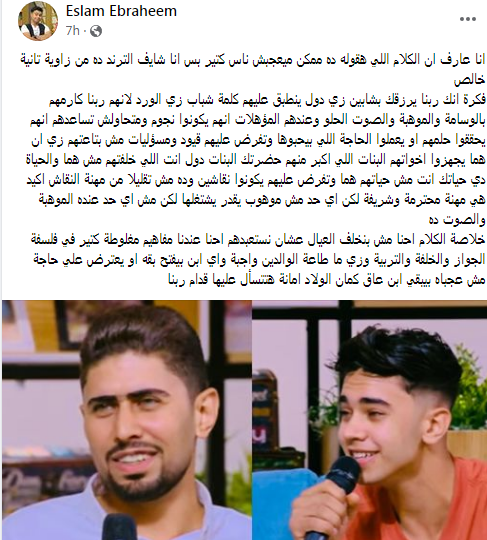 وكتب إسلام إبراهيم على حسابه الشخصي بـ فيسبوك: أنا عارف إن الكلام اللي هقوله ده ممكن ميعجبش ناس كتير بس أنا شايف الترند ده من زاوية تانية خالص، فكرة أنك ربنا يرزقك بشابين زي دول ينطبق عليهم كلمة شباب زي الورد لأنهم ربنا كارمهم بالوسامة والموهبة والصوت الحلو وعندهم المؤهلات أنهم يكونوا نجوم ومتحاولش تساعدهم أنهم يحققوا حلمهم أو يعملوا الحاجة اللي بيحبوها.