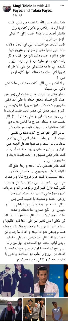 وكتب الأم المكلومة عبر حسابها على فيسبوك: ماذا بينك وبين الله يا قطعة من قلبي، كنت دايما لوحدك بتكتب وتفكر وكنت بتقول ماليش أصحاب يا ماما طيب إزاي؟ قولي أفهمها دي إزاي ؟.. طيب الآلاف من الشباب اللي زي الورد ولاد وبنات اللي كانوا معايا وحواليا وعينيهم كلها حزن وألم وحب ووفاء نابع من القلب، وكل واحد فيهم مش عارف يعمل لي إيه عايزين يقدموا أي حاجة، يشيلوني من علي الأرض لو قدروا، لأني أمك حته منك دول كلهم إيه يا علي؟