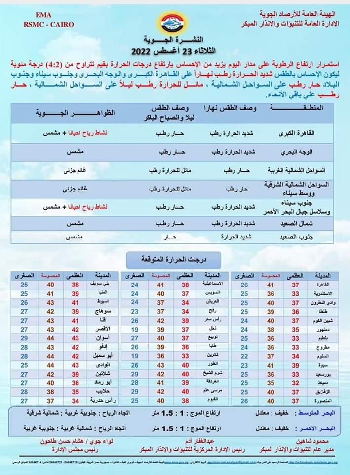 أعلنت هيئة الأرصاد الجوية تفاصيل حالة الطقس التي تشهدها الجمهورية غدا الثلاثاء 23 أغسطس 2022، موضحة أبرز الظواهر الجوية المتوقعة خلال الفترة المقبلة.