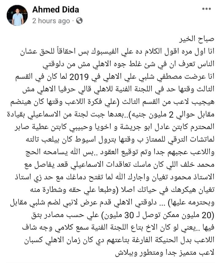 وكتب ديدا وكيل مصطفى شلبي السابق عبر صفحته على موقع التواصل الاجتماعي فيسبوك: “صباح الخير.. انا اول مره اقول الكلام ده علي الفيسبوك بس احقاقًا للحق عشان الناس تعرف ان في شئ غلط جوه الاهلي مش من دلوقتي.. انا عرضت مصطفي شلبي علي الاهلي في 2019 لما كان في القسم الثالث وقتها حد في اللجنة الفنية للاهلي قالي حرفيا الاهلي مش هيجيب لاعب من القسم الثالث (علي فكرة اللاعب وقتها كان هينضم مقابل حوالي 2 مليون جنيه).. بعدها جبت لجنة من الاسماعيلي بقيادة المحترم كابتن عادل ابو جريشة واخويا وحبيبي كابتن عطية صابر لماتشات الترقي للممتاز ب وقتها بترول اسيوط كان بيلعب تالته واللاعب عجبهم جدا وتم توقيع العقود..بس الله يسامحه الحج محمد خلف اللي كان ماسك تعاقدات الاسماعيلي قعد يفاصل مع الاستاذ محمود تغيان واجارك الله لما تفتح دماغك مع حد زي استاذ تغيان هيكرهك في حياتك اصلا (وطبعا علي حقه وشطارة منه وبحترمه عليها)... دلوقتي الاهلي قدم عرض لانبي لضم شلبي مقابل (20 مليون ممكن توصل لـ 30 مليون) علي حسب مصادر بثق فيها..يعني لو كان الاخ بتاع اللجنة الفنية سمع كلامي وجه شاف اللاعب بدل الحنيكة الفارغة بتاعتهم دي كان زمان الاهلي كسبان لاعب متميز جدا ومتطور وببلاش”.