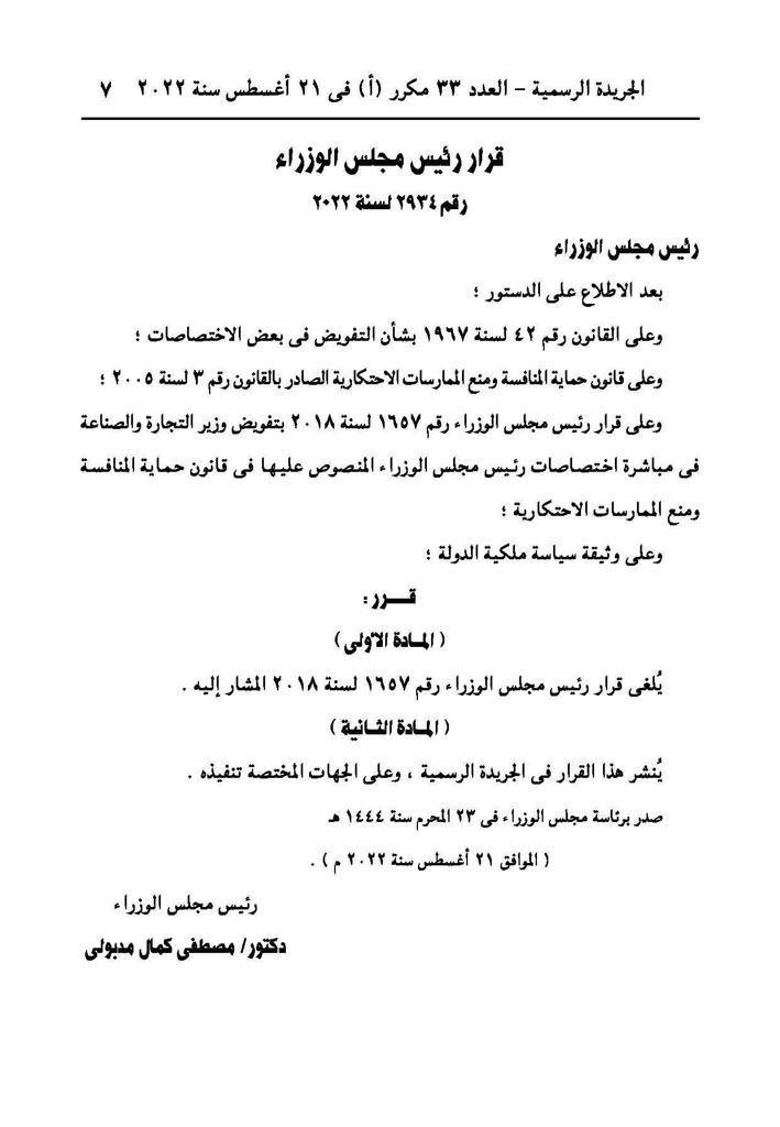 قرر رئيس الوزراء مصطفى مدبولي إلغاء قرار تفويض وزير التجارة والصناعة، باختصاصاته في عمل جهاز حماية المنافسة ومنع الممارسات الاحتكارية.