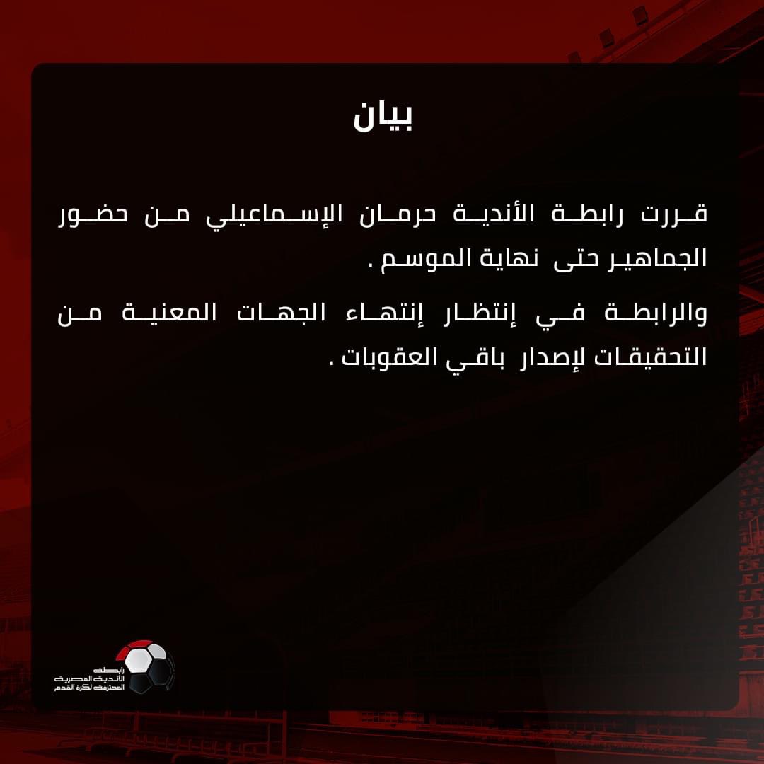 ونشرت رابطة الأندية المصرية بيانًا رسميًا عبر حسابهم الرسمي على موقع التواصل الاجتماعي تويتر، ينص على: قررت رابطة الأندية حرمان الإسماعيلي من حضور الجماهير حتى نهاية الموسم، والرابطة في انتظار انتهاء الجهات المعينة من التحقيقات لإصدار باقي العقوبات.