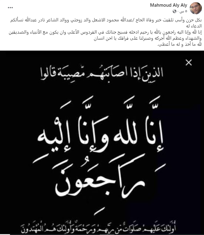 وكتب أحد المقربين من الشاعر نادر عبد الله منشورًا، عبر فيسبوك، جاء فيه: بكل حزن وأسى تلقيت خبر وفاة الحاج عبد الله محمود الأشعل والد زوجتي، ووالد الشاعر نادر عبد الله، نسألكم الدعاء له، إنا لله وإنا اليه راجعون.. يا لله يا رحيم ادخله فسيح جناتك في الفردوس الأعلى، وأن يكون مع الأنبياء والصديقين والشهداء وعظم الله أجره، وصبر لنا على فراقك يا أحن إنسان.. لله ما أخذ وله ما أعطى.