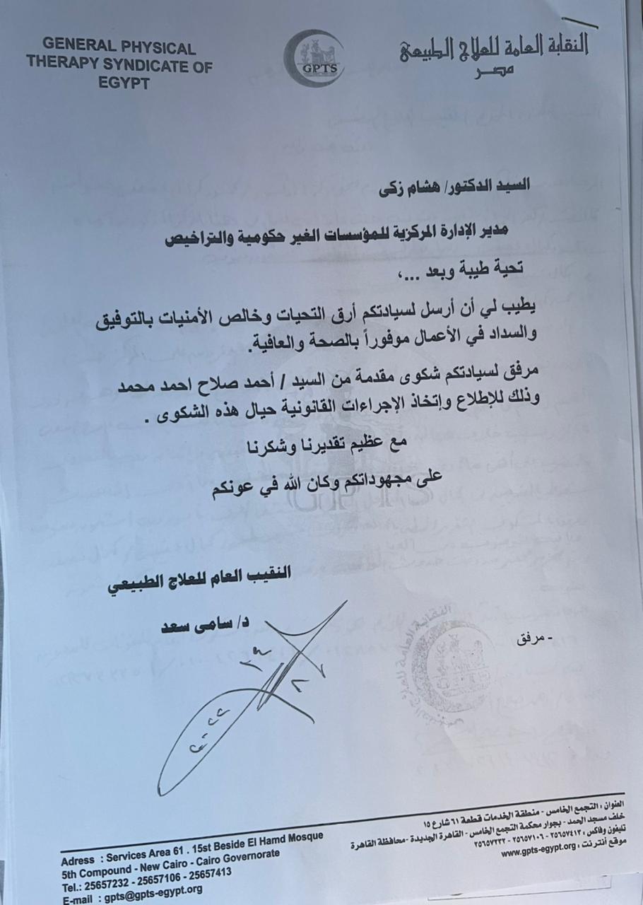 وعندما توجه لنقابة العلاج الطبيعي للتقدم بشكوى، أفادت النقابة بعدم قيده بها وأنه غير مسموح له بممارسة مهنة العلاج الطبيعي، حيث إن الطبيب حاصل على بكالوريوس الطب والجراحة، وأخصائي تدليك رياضي وإصابات ملاعب، ما دفع النقابة لإحالة الشكوى إلى إدارة العلاج الحر بوزارة الصحة والسكان، وذلك بحسب قوله.