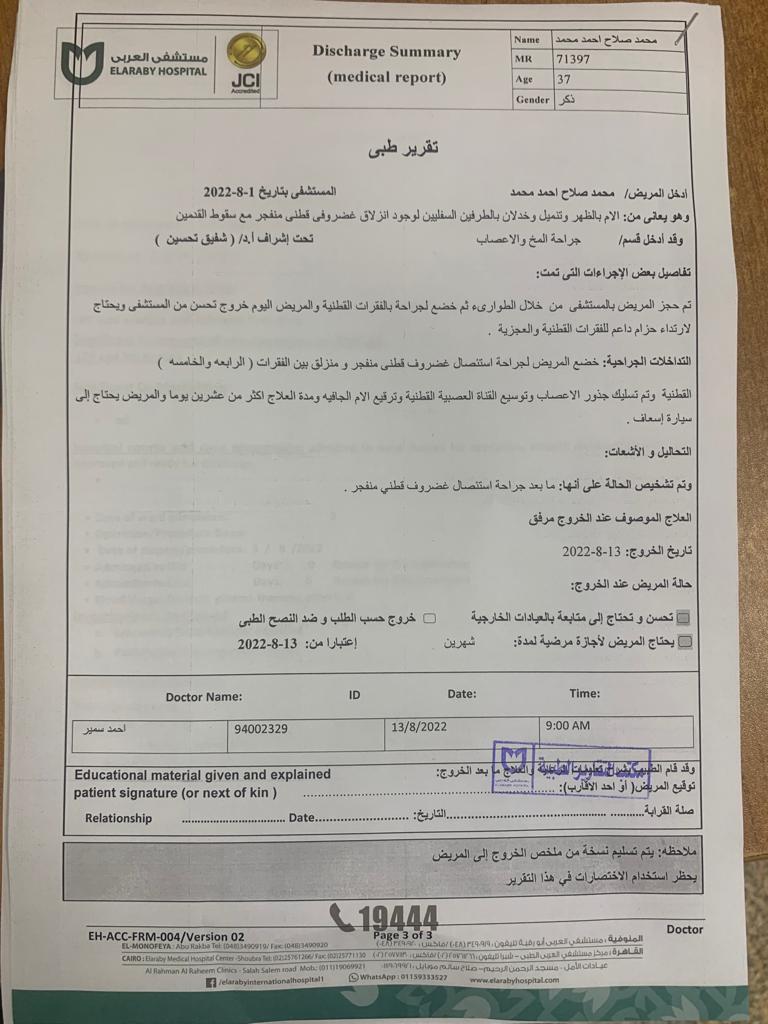 وأضاف شقيقه، أن المستشفى شخصت حالة أخيه بأنه يعاني من تنميل بالطرفين السفليين لوجود انفجار غضروف بالقطنية وانزلاقها إلى جانب سقوط القدمين، ما يعني عدم قدرته على السير على قدميه بشكل طبيعي مرة أخرى.