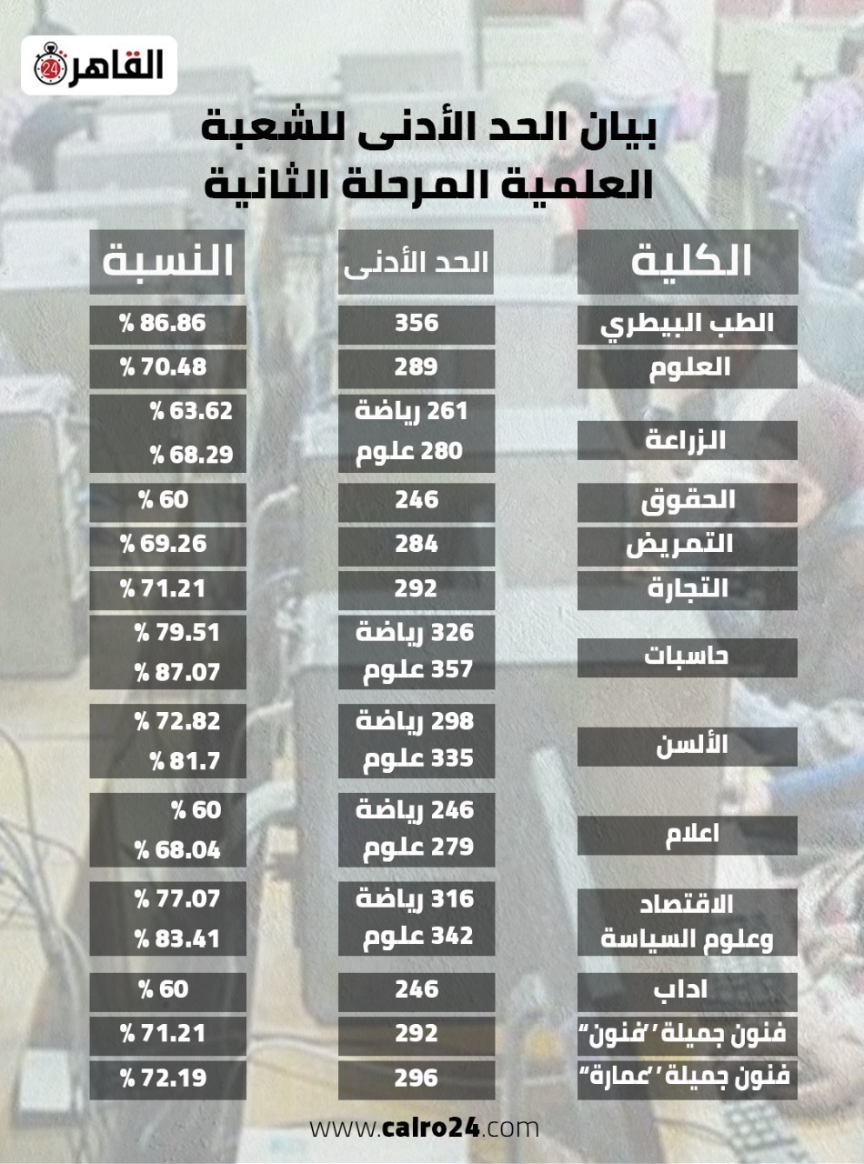 نتيجة تنسيق المرحلة الثانية 2022.. الحد الأدنى لحاسبات معلومات علمي علوم 87.07% ورياضة 79.51%.