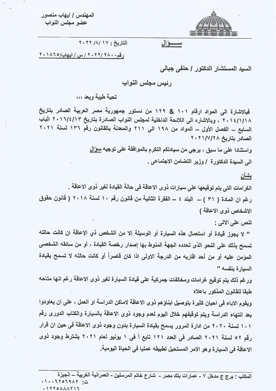 تقدم المهندس إيهاب منصور، رئيس الهيئة البرلمانية للحزب المصري الديمقراطي الاجتماعي، بسؤال موجه إلى الدكتورة نيفين القباج، وزيرة التضامن الاجتماعي بشأن الغرامات التي يتم توقيعها على سيارات ذوي الإعاقة في حالة قيادة آخرين لها.