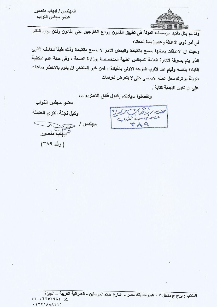 وبيّن عضو مجلس النواب، أن الكتاب الدورى رقم 101 لسنة 2020 من إدارة المرور يسمح بقيادة السيارة دون وجود ذوي الإعاقة، في حين أن قرار رقم 52 لسنة 2021 الصادر في العدد 121 تابع أ في 1 يونيو لعام 2021 يشترط وجودهم في السيارة، وهو الأمر المستحيل تطبيقه عمليا في الحياة اليومية، مؤكدًا أن بعض الإعاقات تسمح بالقيادة وبعضها لا، وذلك طبقًا للكشف الطبي الذي يتم بمعرفة الإدارة العامة للمجالس الطبية المتخصصة بوزارة الصحة، يصبح من غير المنطقي في حالة عدم إمكانية قيادة ذي الإعاقة لسيارته بنفسه وقيام أحد أقارب الدرجة الأولى بالقيادة أن ينتظر ساعات طويلة أو يترك محل عمله حتى لا يتعرض للغرامة أثناء قيادة السيارة دون وجود صاحبها.