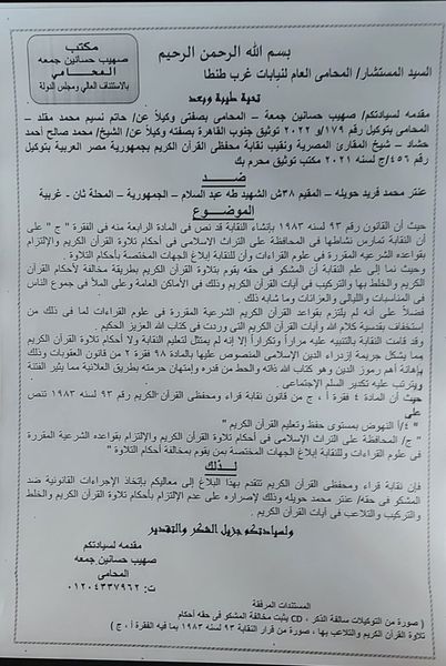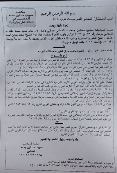 أعلنت النقابة العامة لقراء ومحفظي القرآن الكريم، برئاسة الشيخ محمد صالح حشاد، نقيب القراء، أنه تم رفع دعويين قضائيتين ضد اثنين من المتلاعبين بكتاب الله عز وجل وهما: هشام سمير عنتر، مسلم من محافظة الغربية، والثاني: عنتر محمد فريد حويله من محافظة الغربية.