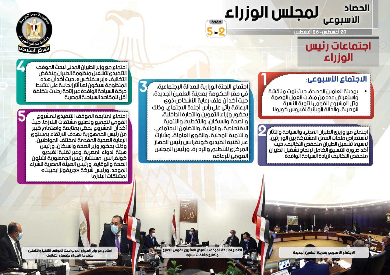 وعلى صعيد الاجتماعات التي عقدها الدكتور مصطفى مدبولي رئيس مجلس الوزراء، أوضح التقرير أنه تم عقد اجتماع مع وزيري الطيران المدني، والسياحة والآثار لاستعراض ملفات العمل المشتركة بين الوزارتين، لاسيما تشغيل الطيران منخفض التكاليف، حيث أكد ضرورة التنسيق الكامل لإنجاح تشغيل الطيران منخفض التكاليف لزيادة السياحة الوافدة، بالإضافة إلى اجتماع مع وزير الطيران المدني لبحث الموقف التنفيذي لتشغيل منظومة الطيران منخفض التكاليف إير سفنكس، حيث أكد أن هذه المنظومة سيكون لها آثار إيجابية على تنشيط حركة السياحة الوافدة عبر إتاحة رحلات بتكلفة أقل للمقاصد السياحية المصرية، فضلًا عن اجتماع لمتابعة الموقف التنفيذي للمشروع القومي لتجميع وتصنيع مشتقات البلازما، حيث أكد أن المشروع يحظى بمتابعة واهتمام كبير من رئيس الجمهورية بهدف الارتقاء بمستوى الرعاية الصحية المقدمة لمختلف المواطنين، وذلك بحضور وزير الصحة والسكان، ورئيس هيئة الدواء المصرية، وعبر تقنية الفيديو كونفرانس، مستشار رئيس الجمهورية لشئون الصحة والوقاية، ورئيس الهيئة المصرية للشراء الموحد، ورئيس شركة "جريفولز ايجيبت" لمشتقات البلازما، بجانب اجتماع لمتابعة موقف تنفيذ المشروع القومي لتنمية الأسرة المصرية، حيث أكد أن هذا المشروع ذو أهمية كبيرة للدولة المصرية بالنظر إلى مستهدفاته التي تتخذ من "الأسرة المصرية" ركيزة رئيسية نحو بناء الجمهورية الجديدة، وذلك بحضور وزيري الصحة والسكان، والتخطيط والتنمية الاقتصادية، وعبر تقنية الفيديو كونفرانس وزيرتي التعاون الدولي، والتضامن الاجتماعي، ورئيس المجلس القومي للمرأة، وكذلك اجتماع مع وزير قطاع الأعمال العام لمتابعة ملفات عمل الوزارة مثل خطط التطوير وإعادة الهيكلة بالشراكة مع القطاع الخاص، وتسوية مديونيات شركات قطاع الأعمال.
