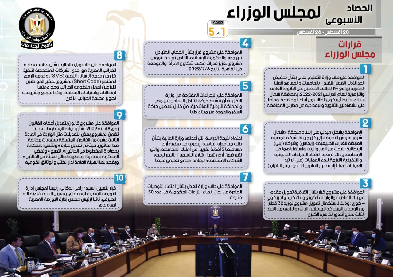 وجاء في التقرير أنه تم إصدار عدد من القرارات، تشمل الموافقة على طلب وزارة التعليم العالي بشأن تخفيض الحد الأدنى المعلن للقبول بالجامعات والمعاهد العليا المصرية بواقع 1% للطلاب الحاصلين على الثانوية العامة والأزهرية للعام الدراسي 2021-2022، بمحافظة شمال سيناء، بشرط أن يكون الطالب من أبناء المحافظة، وحاصلًا على الشهادتين الثانوية والإعدادية من مدارس المحافظة، فضلًا عن الموافقة بشكل مبدئي على إسناد منطقة شمال شرق العريش البحرية إلى كل من الشركة المصرية القابضة للغازات الطبيعية إيجاس، وشركة إيني الإيطالية؛ للبحث عن الغاز والزيت واستغلالهما في المنطقة، وذلك تمهيدًا لاتخاذ الإجراءات القانونية والتنفيذية اللازمة لبدء العمليات على ألا تبدأ العمليات فعليًا إلا بصدور القانون الخاص بمنح الالتزام، بالإضافة إلى الموافقة على مشروع قرار بشأن اتفاقية تمويل مقدم من بنك الصادرات والواردات الكوري وبنك كريدي أجريكول – كوريا؛ وذلك لاستكمال تمويل مشروع توريد 32 قطارًا من الوحدات المتحركة للمرحلتين الثالثة والرابعة من الخط الثالث لمترو أنفاق القاهرة الكبرى، وكذلك الموافقة على مشروع قرار بشأن الخطاب المتبادل بين مصر والحكومة الإسبانية، الخاص بمنحة لتمويل مشروع تعزيز قدرات مكتب شكاوى المرأة، والموقعة في القاهرة بتاريخ 6/7/2022، كما تمت الموافقة على الإجراءات المقترحة من وزارة النقل بشأن تنشيط حركة التبادل السياحي بين مصر والمملكة الأردنية الهاشمية، من خلال تسهيل حركة السفر والعودة عبر ميناء طابا.