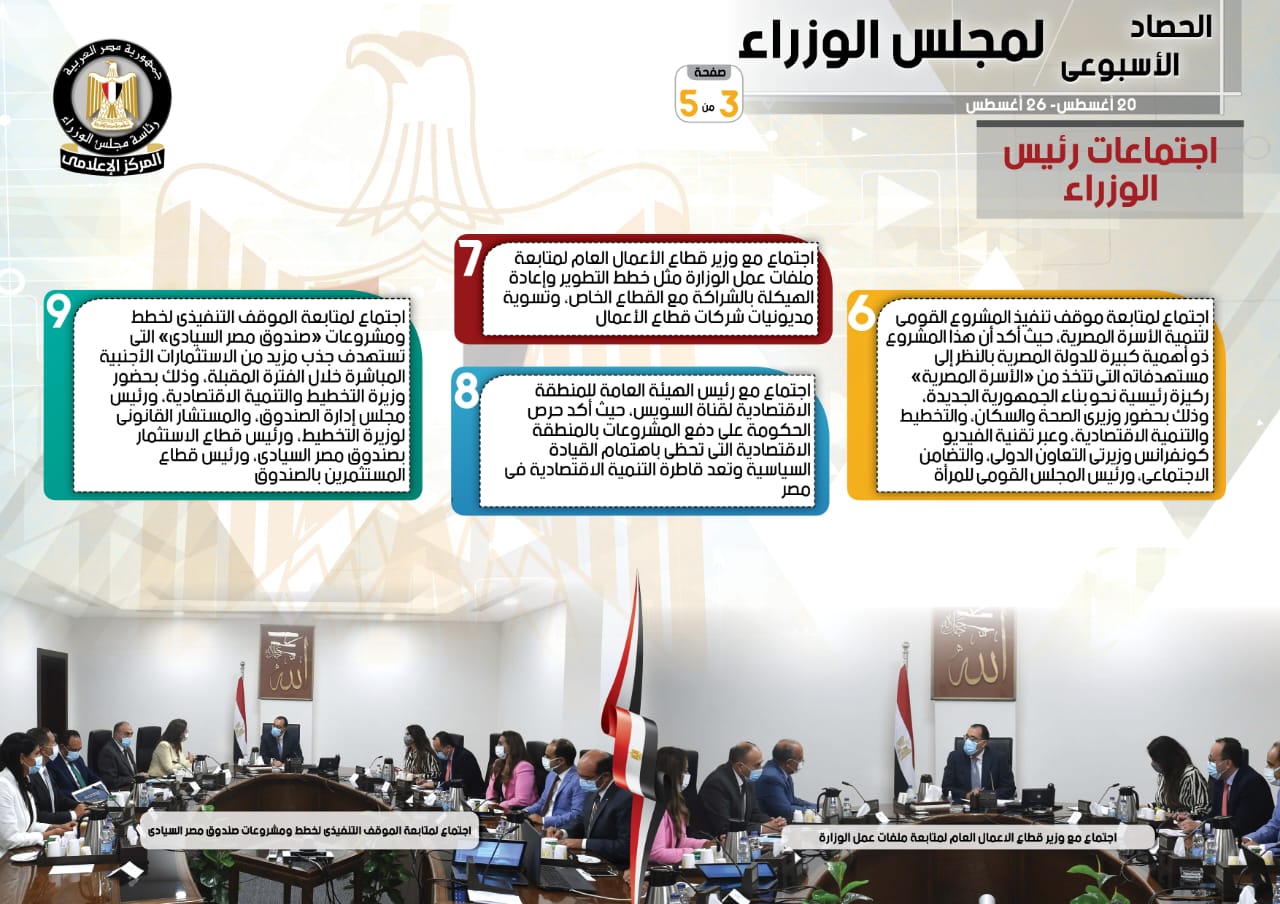 وشملت الاجتماعات أيضًا كما أظهر التقرير، اجتماعًا لمتابعة الموقف التنفيذي لخطط ومشروعات "صندوق مصر السيادي" التي تستهدف جذب مزيد من الاستثمارات الأجنبية المباشرة خلال الفترة المقبلة، وذلك بحضور وزيرة التخطيط والتنمية الاقتصادية، ورئيس مجلس إدارة الصندوق، والمستشار القانوني لوزيرة التخطيط، ورئيس قطاع الاستثمار بصندوق مصر السيادي، ورئيس قطاع المستثمرين بالصندوق، فضلًا عن اجتماع مع رئيس الهيئة العامة للمنطقة الاقتصادية لقناة السويس، حيث أكد حرص الحكومة على دفع المشروعات بالمنطقة الاقتصادية التي تحظى باهتمام القيادة السياسية وتعد قاطرة التنمية الاقتصادية في مصر، كما ترأس سيادته الاجتماع الأسبوعي بمدينة العلمين الجديدة، حيث تمت مناقشة واستعراض عدد من ملفات العمل المهمة مثل المشروع القومي لتنمية الأسرة المصرية، والحالة الوبائية لفيروس كورونا، بجانب اجتماع اللجنة الوزارية للعدالة الاجتماعية، في مقر الحكومة بمدينة العلمين الجديدة، حيث أكد أن ملف رعاية الأشخاص ذوي الإعاقة يأتي على رأس أجندة الاجتماع، وذلك بحضور وزراء التموين والتجارة الداخلية، والصحة والسكان، والتخطيط والتنمية الاقتصادية، والمالية، والتضامن الاجتماعي، والتنمية المحلية، والقوى العاملة، وشارك عبر تقنية الفيديو كونفرانس رئيس الجهاز المركزي للتنظيم والإدارة، ورئيس المجلس القومي للإعاقة.