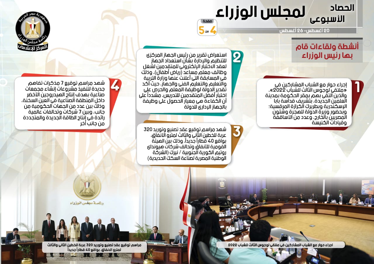 نشر المركز الإعلامي لـ مجلس الوزراء، تقريرًا شمل إنفوجرافات سلط من خلالها الضوء على الحصاد الأسبوعي لمجلس الوزراء، وذلك خلال الفترة من 20 حتى 26 أغسطس 2022، والذي تضمن الموافقة على عدد من القرارات، فضلًا عن الاجتماعات واللقاءات التي عقدها الدكتور مصطفى مدبولي، رئيس مجلس الوزراء، بالإضافة إلى ما قام به من أنشطة.