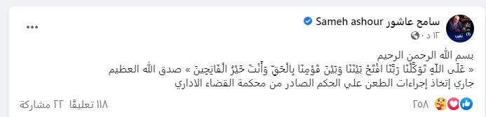 وكتب سامح عاشور في منشوره قائلًا: “جاري الاطلاع على أسباب حكم الاستبعاد من الانتخابات الصادر من محكمة القضاء الإداري لاتخاذ ما يلزم.. والله ولي التوفيق”.