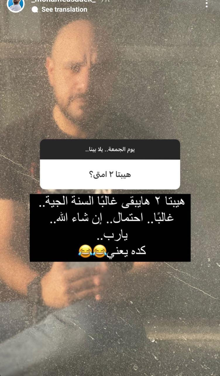 رد محمد صادق عبر حسابه الشخصي بـ انستجرام عبر خاصية الاستوري على أحد المتابعين: هيبتا 2 امتى؟، ليرد عليه محمد صادق: هيبتا 2 هيبقى غالبًا السنة الجاية غالبًا احتمال إن شاء الله، كده يعني.