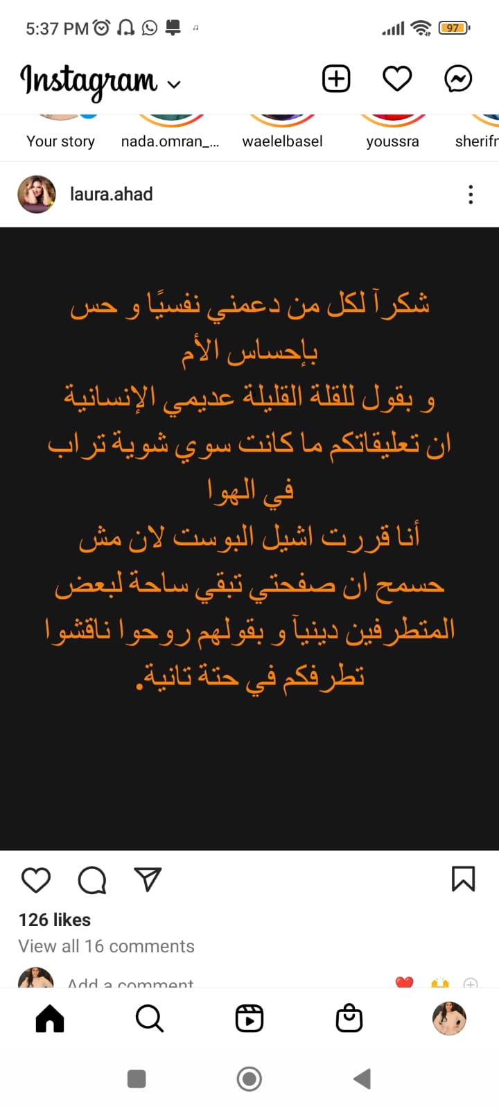 وأضافت لورا عماد: بقولكم مبروك عليكم عيلتكم الجديدة! وهقولكم حاجة واحدة بس! اللي مالوش خير في أمه ملوش خير في حد! بتمنالكم كل خير وصحة وإن ربنا يهديكم في يوم من الأيام! بس ربنا موجود وكبير قادر على اللي عمل فيكم كده إنه يرده ليه في يوم من الأيام! مامي لورا يمكن تكونوا نسيتوا اسمي.