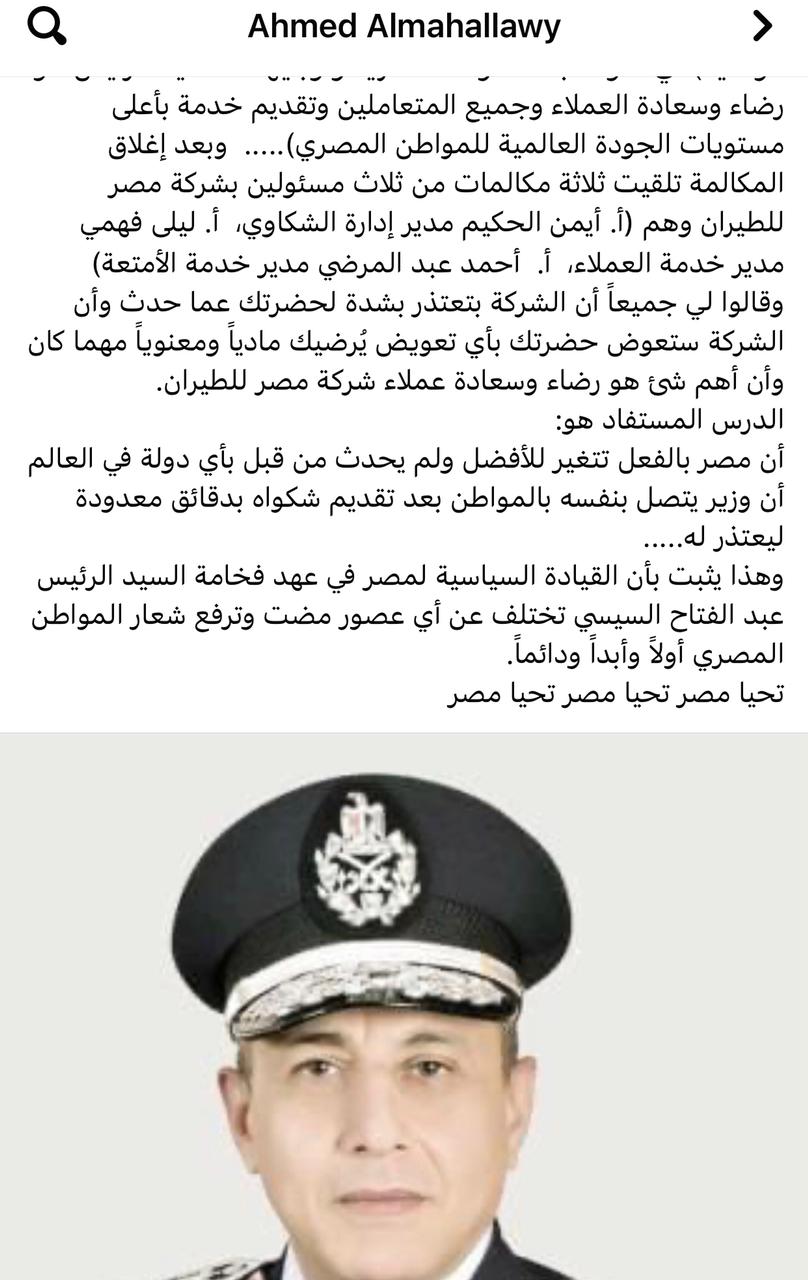 وأضاف الراكب: "عند وصولي للبيت مباشرة تلقيت مكالمة من رقم (غير معروف) وعند فتح المكالمة قال لي المتحدث بالحرف (الدكتور أحمد المحلاوي معايا - رديت بنعم يا فندم، فقال لي مع حضرتك الفريق محمد عباس وزير الطيران وأنا بعتذر بشدة لحضرتك عما حدث لحقيبة سفرك، وقد أصدرت أوامر للمسئولين بشركة مصر للطيران بأن يقوموا بتعويضك عما حدث تعويضًا ماديًا ومعنويًا لأن هدفنا بوزارة الطيران وشركة مصر للطيران (الشركة الوطنية) في ضوء اتجاه الدولة المصرية وتوجيهات السيد الرئيس هو رضاء وسعادة العملاء وجميع المتعاملين وتقديم خدمة بأعلى مستويات الجودة العالمية للمواطن المصري).