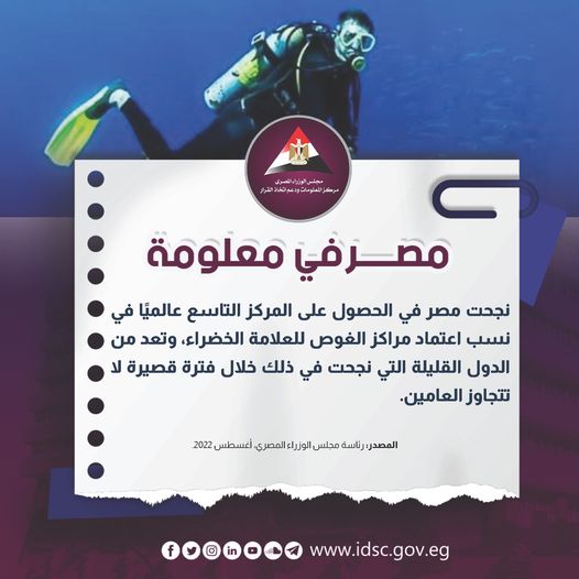 نشر مركز المعلومات التابع إلى مجلس الوزراء، إنفوجراف سلّط الضوء من خلاله على حصول الدولة المصرية على المركز التاسع عالميًا في نسب اعتماد مراكز الغوص للعلامة الخضراء، مشيرًا إلى أنها تعد من الدول القليلة التي نجحت في ذلك خلال فترة قصيرة لا تتجاوز عامين.