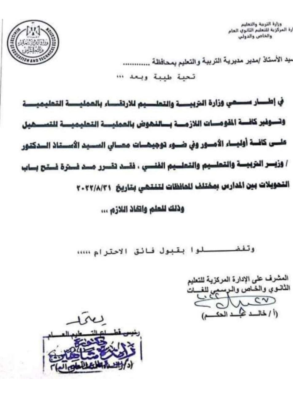 وجهت وزارة التربية والتعليم والتعليم الفني، خطابًا لجميع المديريات التعليمية، بشأن مدّ فترة فتح باب التحويلات بين المدارس بمختلف المحافظات للعام الدراسي المقبل 2022-2023، لجميع المراحل التعليمية.