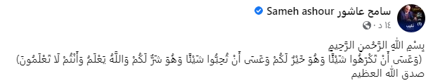 ونشر عاشور تغريده عبر حسابه الرسمي بـ فيسبوك قائلًا مستعينا بآية من كتاب الله الحكيم: بِسْمِ اللهِ الرَّحْمنِ الرَّحِيمِِ (وَعَسَى أَنْ تَكْرَهُوا شَيْئًا وَهُوَ خَيْرٌ لَكُمْ وَعَسَى أَنْ تُحِبُّوا شَيْئًا وَهُوَ شَرٌّ لَكُمْ وَاللَّهُ يَعْلَمُ وَأَنْتُمْ لَا تَعْلَمُونَ) صدق الله العظيم