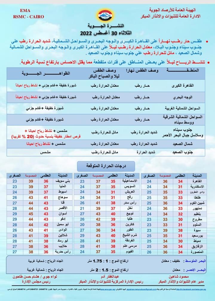 كشفت هيئة الأرصاد الجوية؛ تفاصيل حالة الطقس التي تشهدها مصر خلال يوم غدًا الثلاثاء، الموافق 30 أغسطس لعام 2022، حيث يسود طقس حار رطب نهارا على القاهرة الكبرى والوجه البحري والسواحل الشمالية، في حين يكون الطقس شديد الحرارة على جنوب سيناء وجنوب البلاد.