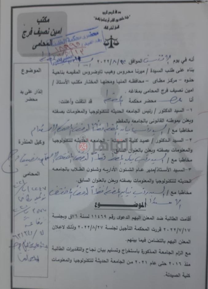 نشر القاهرة 24، في أغسطس 2021، استغاثة ميرنا محروس وهيب، الحاصلة على شهادة الثانوية العامة من مدرستها بمحافظة المنيا، وشهادة تحركات تنفي وجودها خارج مصر خلال فترة أدائها للثانوية العامة، حيث أعربت عن صدمتها، حين أبلغتها الجامعة بوجود مذكرة من وزارة التربية والتعليم لإدارة الجامعة، تُفيد بتزويرها لشهادة الثانوية العامة، وحصولها على شهادة من سلطنة عمان، على الرغم من أنها لم تخرج من مصر يومًا.
