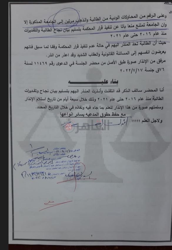 وأضافت: المحكمة أقرت غرامة على الجامعة لعدم تقديمها ملف الطالبة، ووجهت للجامعة ولعميد الكلية عدة إنذارات، ولكن دون استجابة منهم.