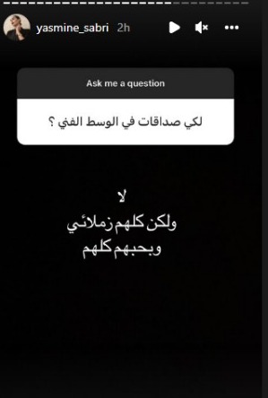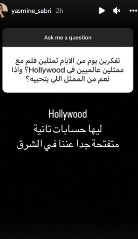 وقالت ياسمين صبري إنها لا تربطها صداقة بأي فنان بالوسط الفني، ولكن جميعهم زملاؤها وتحترمهم، كما أشارت إلى أن فكرة الوصول لـ هوليوود والعالمية ليس بالشيء السهل، لأن الغرب متفتحون عن المجتمع الشرقي.