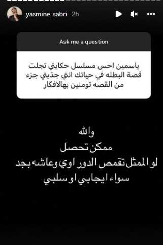 كما أشارت ياسمين صبري إلى أن الممثل يتأثر أحيانًا بالأدوار التي يجسدها، وذلك ردًا على سؤال أحد المتابعين بشأن انعكاس قصة مسلسل حكايتي على حياتها الشخصية، قائلة: ممكن تحصل وتتأثر حياة الممثل بالدور الذي جسده، لو الممثل تقمص الدور أوي وعاشه بجد سواء إيجابي أو سلبي.
