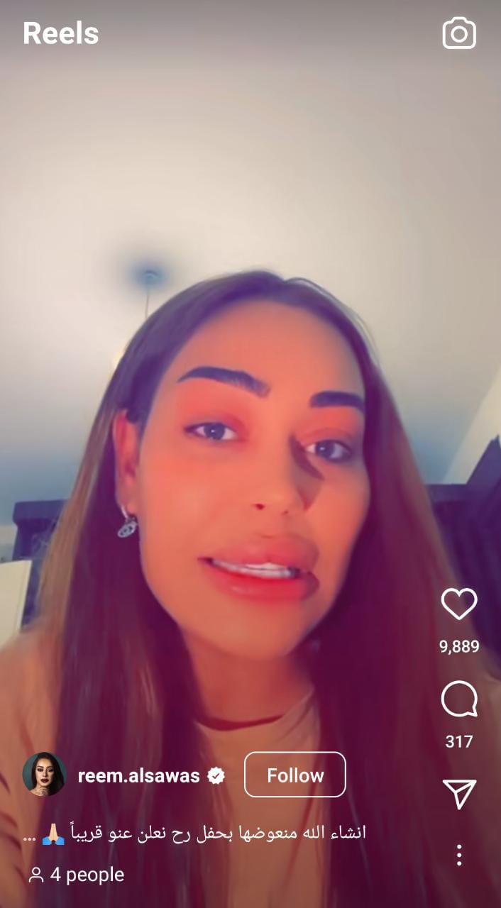 ونشرت ريم السواس، فيديو عبر حسابها الشخصي بموف تبادل الصور والفديوهات انستجرام، قالت خلاله: حبايب قلبي أنا بعتذر ما قدرت أكون معكم يوم السبت في الحفل بسبب عارض صحي كتير قوي، وإن شاء الله نعوضكم الأيام اللي جاية.. بحبكم كتير.